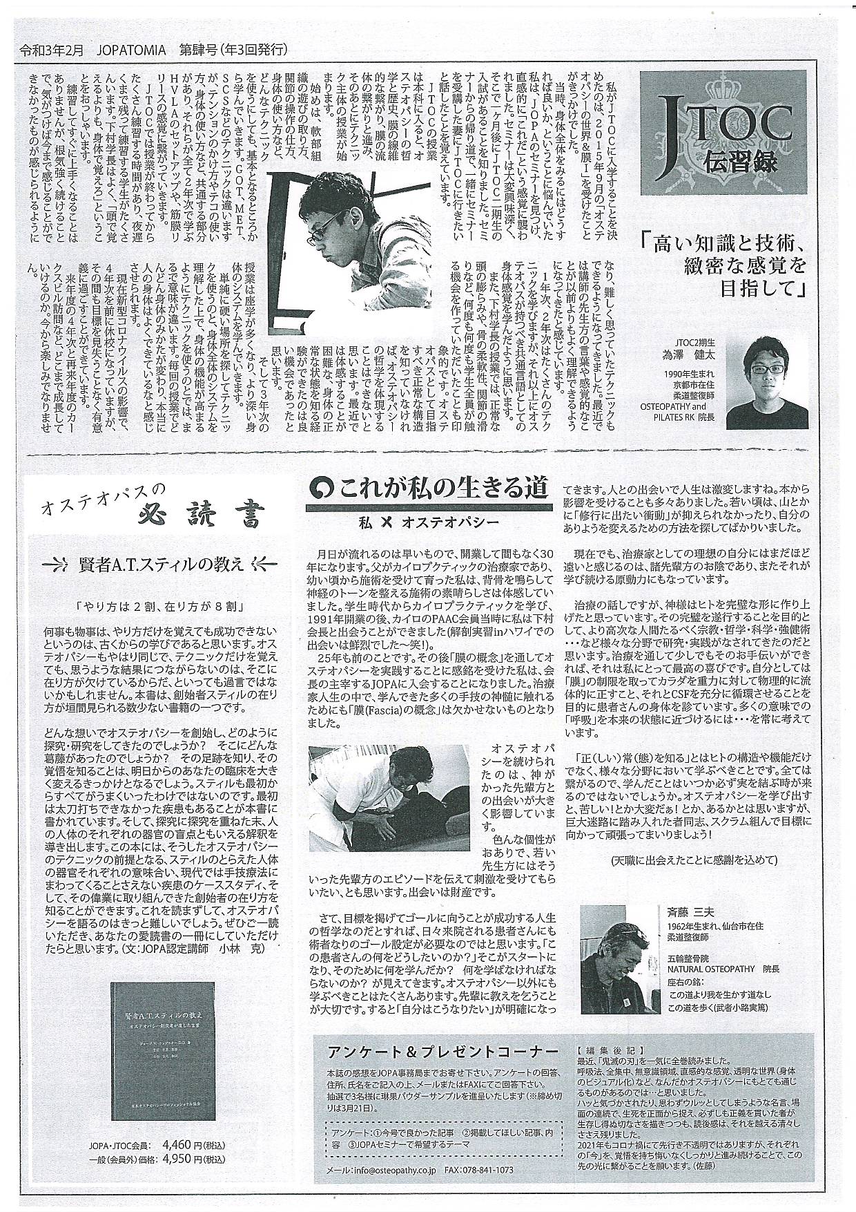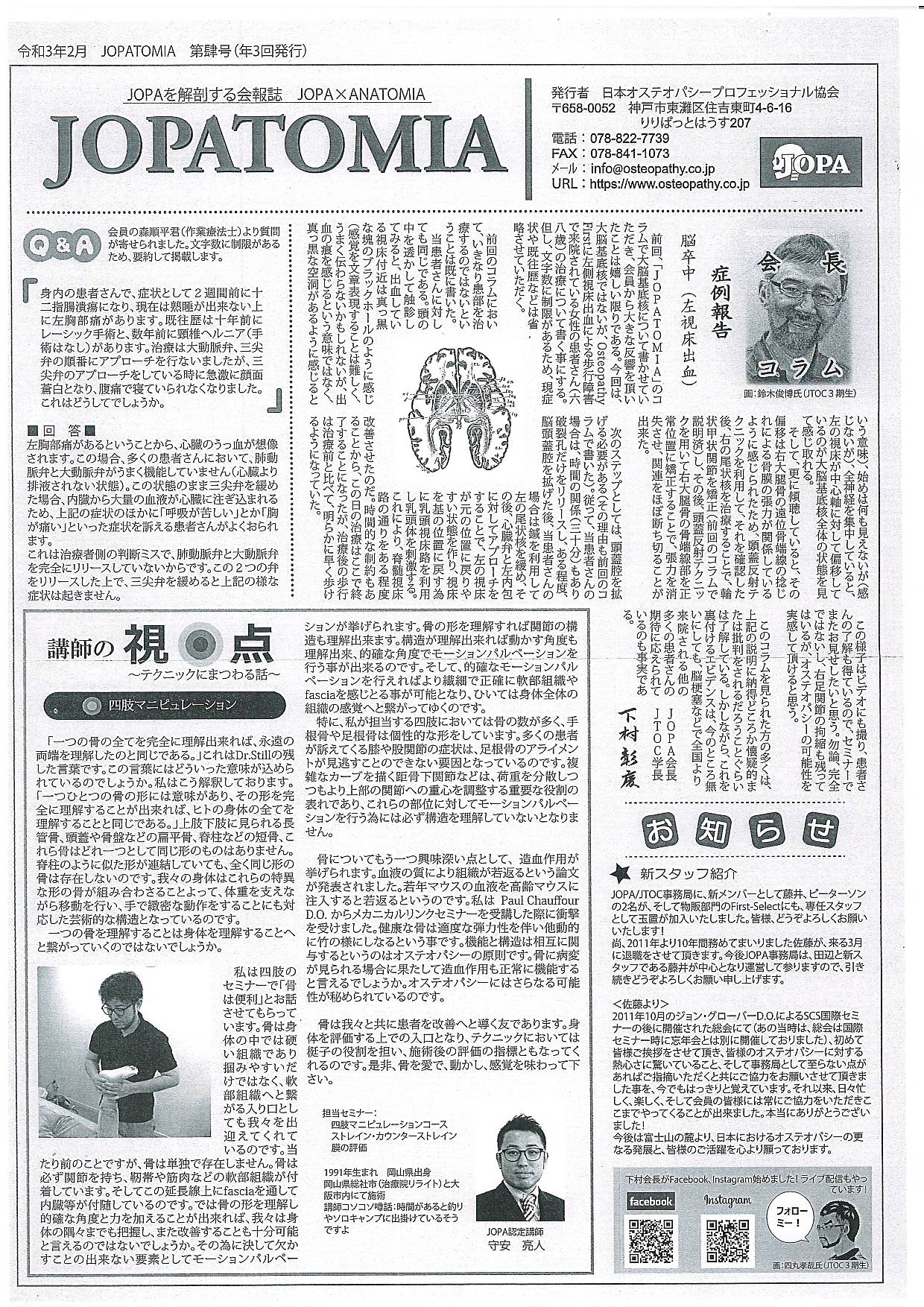 私の所属するJOPA(日本オステオパシープロフェッショナル協会)からJOPA会報詩「JOPATOMIA」第4号が発刊されました。